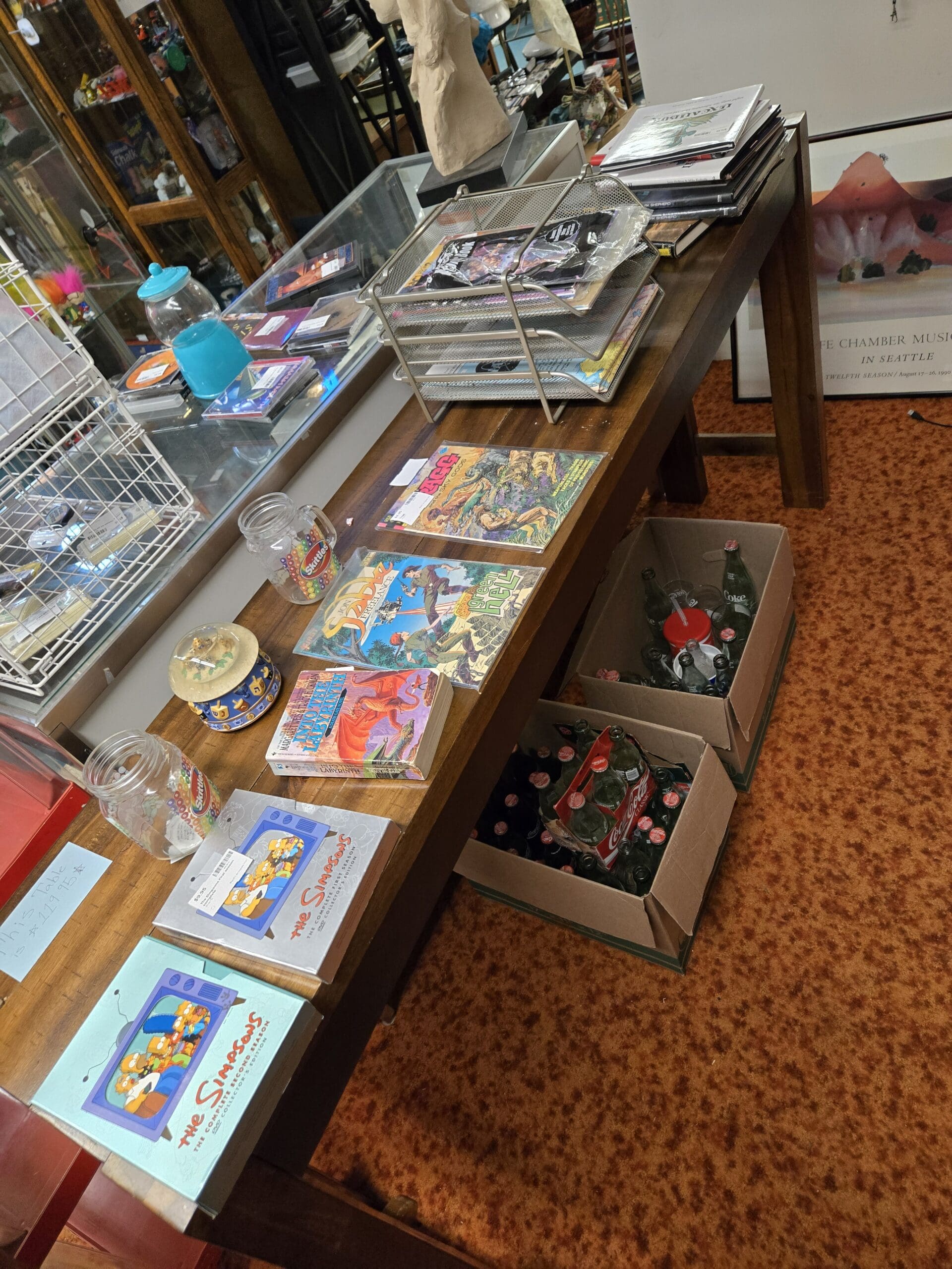 Comic book fans and pop culture collectors will find plenty to flip through here. Graphic novels and single issues spread across a long table alongside The Simpsons complete season box sets, classic Savage Sword and Dexter's Laboratory comics, and a tiered wire rack stuffed with more reading material. Funko Pop figures, PEZ dispensers, a Star Wars lunchbox, and a vintage Dinky Toys sign nod to the die-cast and toy collector crowd. A Coca-Cola shelf unit holds sneakers and a Poker Light Box, while cases of vintage Coke bottles are stashed beneath the tables.