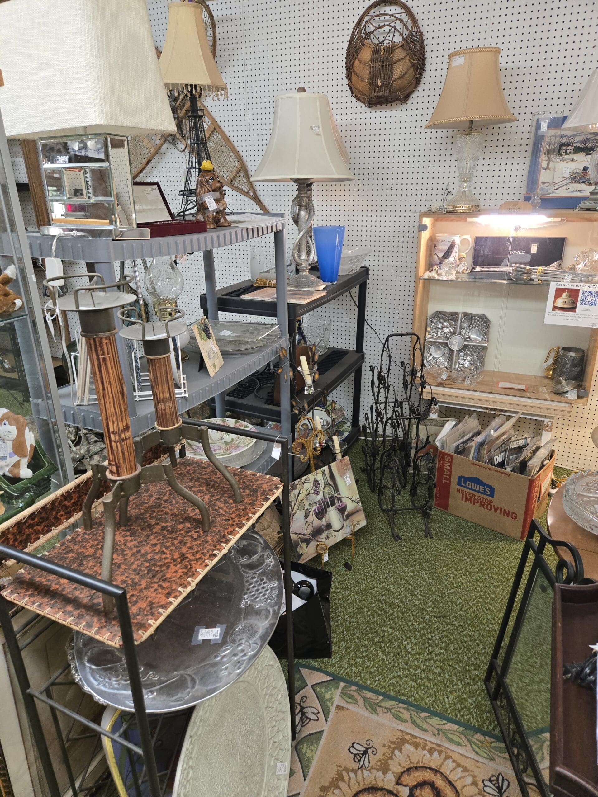 The rest of the shop has a refined, traditional home feel. Vintage table lamps are a specialty here, with elegant options throughout, including a hand-painted botanical urn lamp, a twisted silver candlestick-style lamp, a crystal and brass piece, and a cane-panel room divider that adds a touch of old-fashioned sophistication. A claw-foot mahogany pedestal table holds white lace linens and coffee table books, while a maple drop-leaf side table and a spindle-turned magazine rack sit nearby. Towle silver flatware, ornate pewter serving pieces, and pressed aluminum floral trays speak to collectors with an eye for fine tableware.