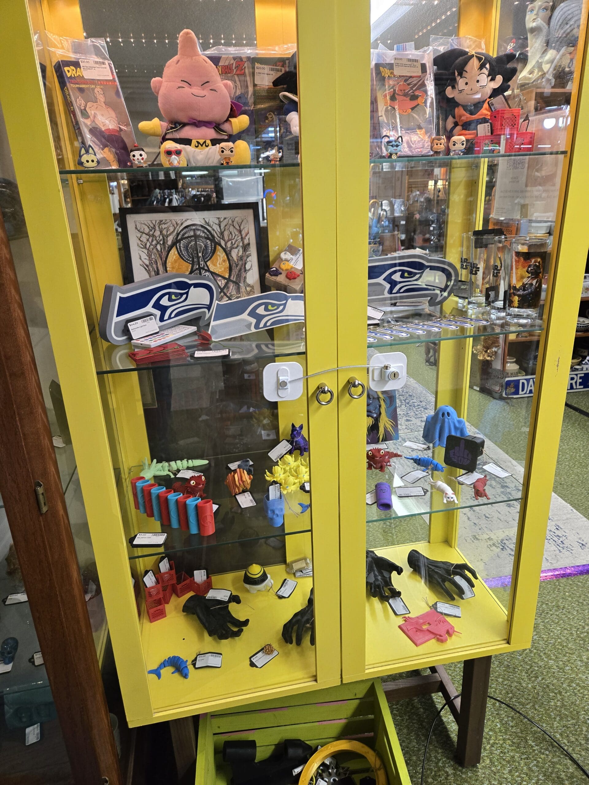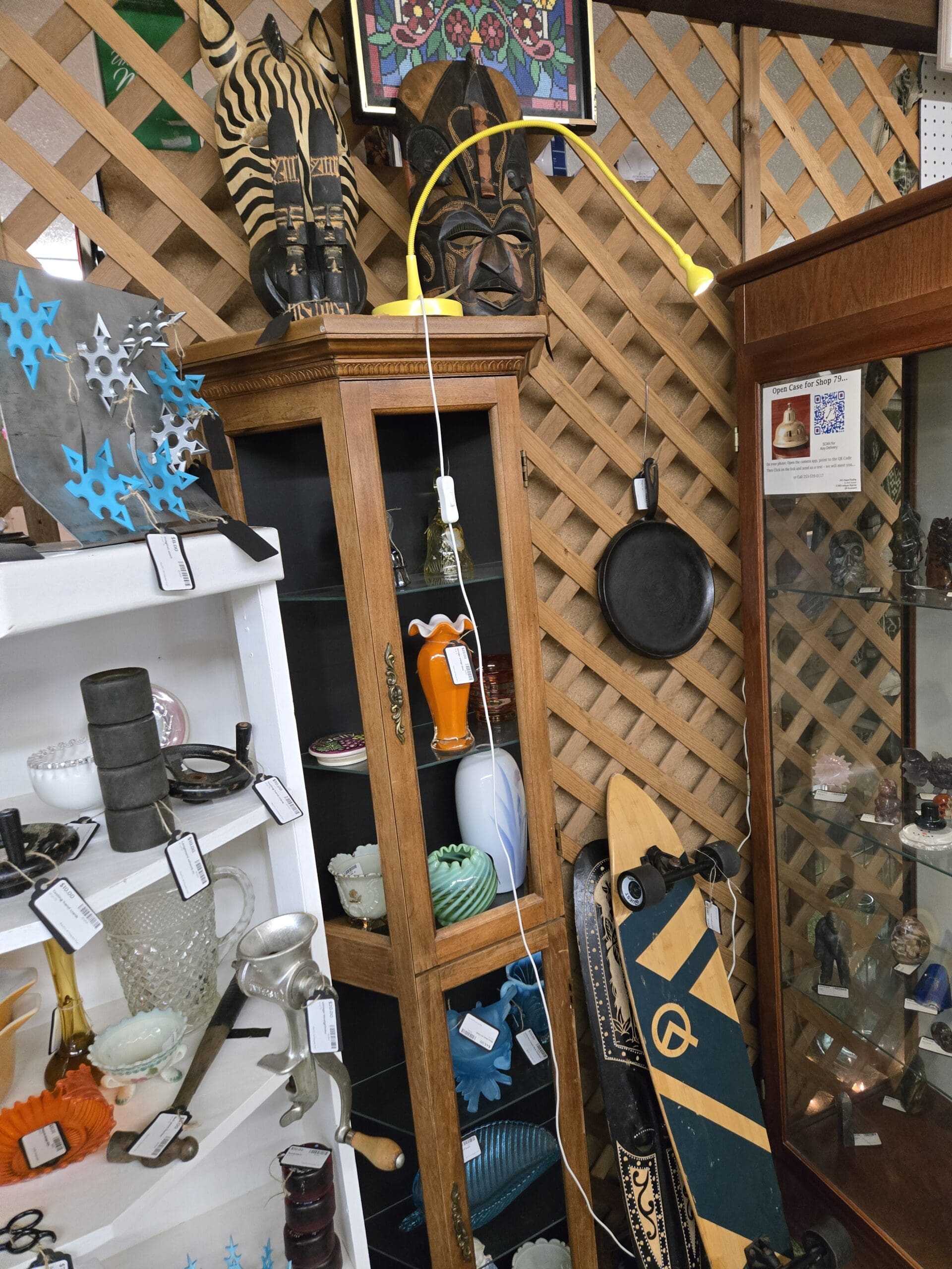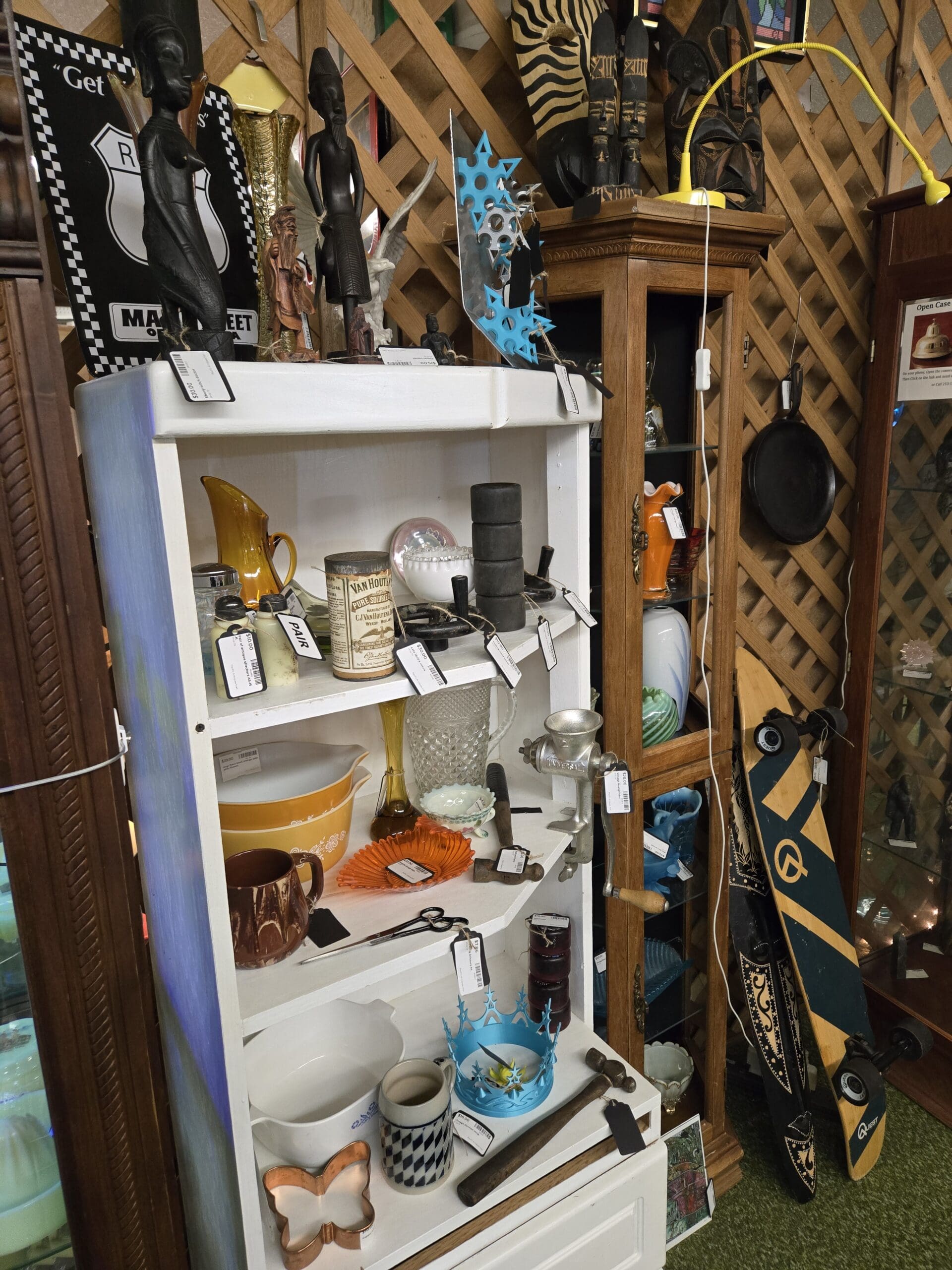 The rest of Shop 79 keeps the surprises coming. A white bookcase holds amber Pyrex mixing bowls, a copper Moscow Mule mug, a Van Houten's cocoa tin, pressed glass pitchers, and a vintage hand-crank meat grinder. Carved African figures and wooden zebra and tribal masks line the lattice walls overhead. A bright yellow cabinet showcases Dragon Ball Z plush toys, Seahawks logo signs, Funko Pops, and colorful 3D-printed figures. Out front, a black Peugeot folding bicycle leans next to a mid-century coffee table stacked with plaid thermoses, a Coca-Cola sign, Saab car books, and a longboard skateboard propped against the wall. Shop 79 is a place where no two items are alike, and that's exactly what makes it worth exploring.