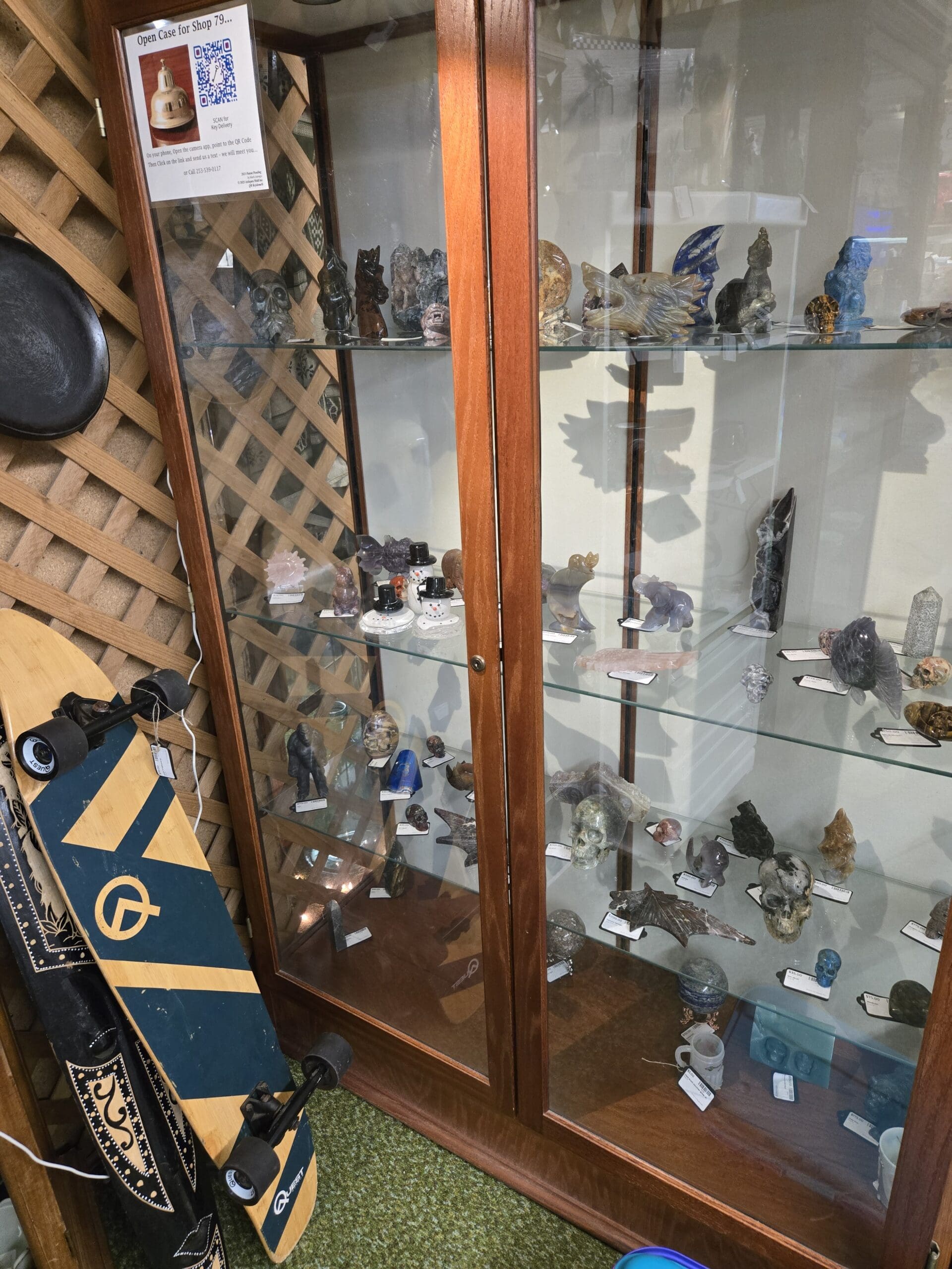 Crystal and stone carving enthusiasts will want to take their time with the tall mahogany cabinet filled entirely with hand-carved mineral figures. You'll find skulls in amethyst and jasper, sodalite dolphins, rose quartz owls, agate eagles, and crystal points in a range of colors and sizes. Each piece catches the light differently, and the craftsmanship ranges from whimsical little animals to impressively detailed larger carvings. It's a collection that appeals equally to rock hounds and anyone looking for a unique decorative accent.