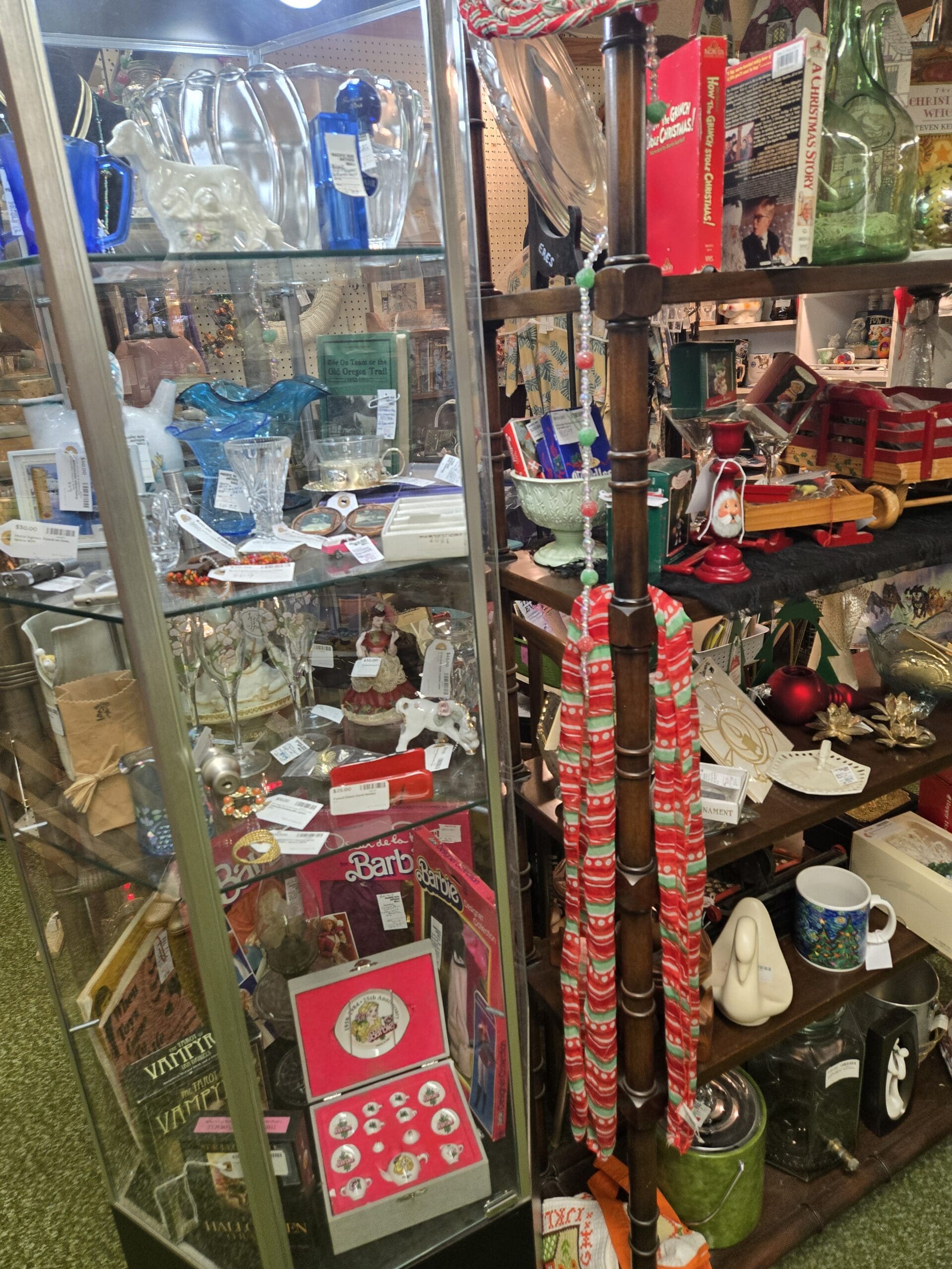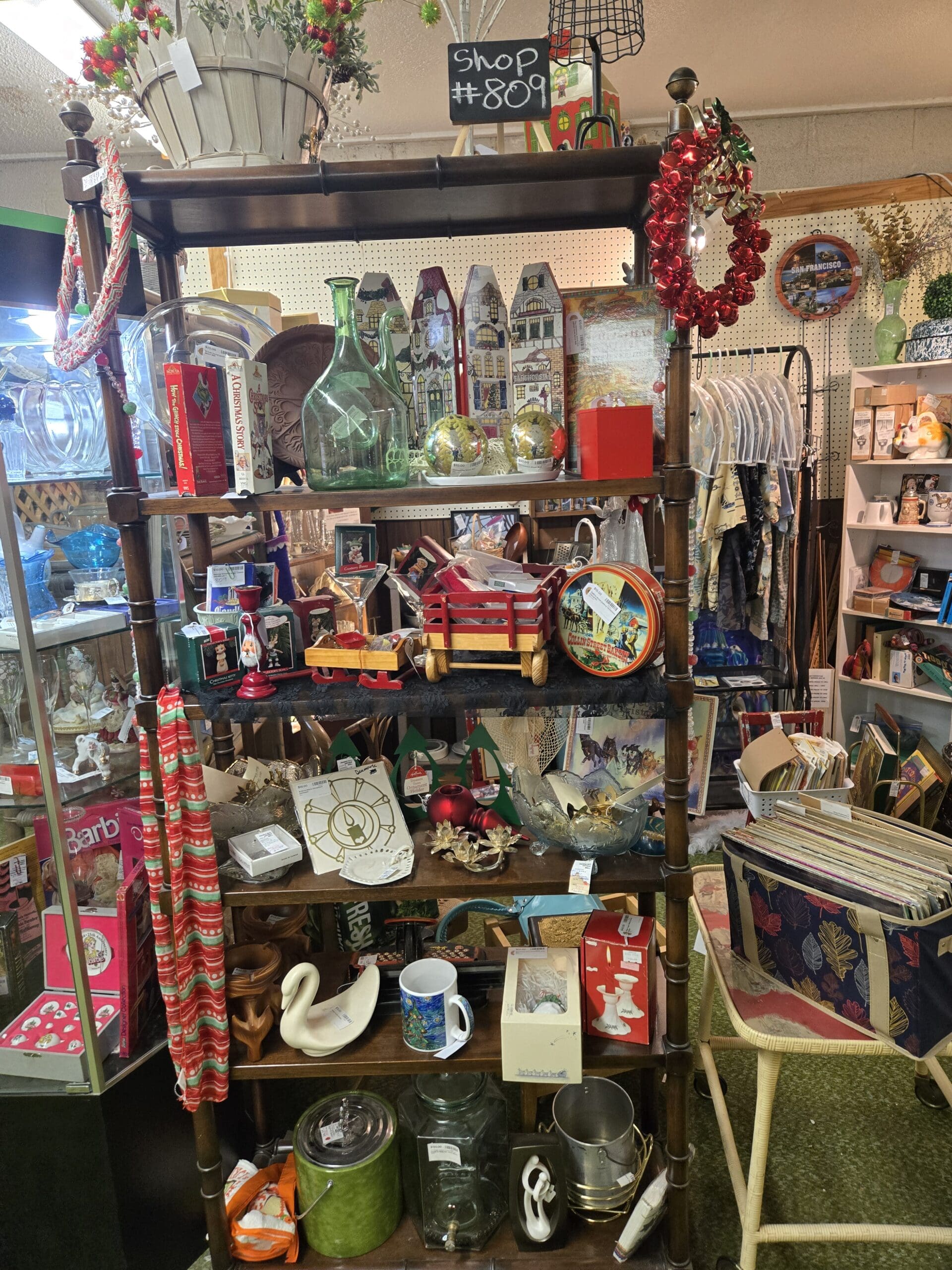Visit Shop 809, where holiday spirit and everyday nostalgia share the shelves in equal measure. A bamboo-turned étagère anchors the space, loaded with Christmas treasures: painted wooden row houses, green glass demijohn bottles, golden mercury glass ornaments, a wooden toy wagon, a red Santa candleholder, brass poinsettia candle clips, and boxed ornament sets. Copies of "How the Grinch Stole Christmas!" and "A Christmas Story" peek out from a shelf alongside holiday tins and a red jingle bell garland. A lighted cabinet holds its own mix of goodies, including Barbie dolls in original packaging, porcelain figurines, cobalt and teal art glass pieces, and a white ceramic owl.