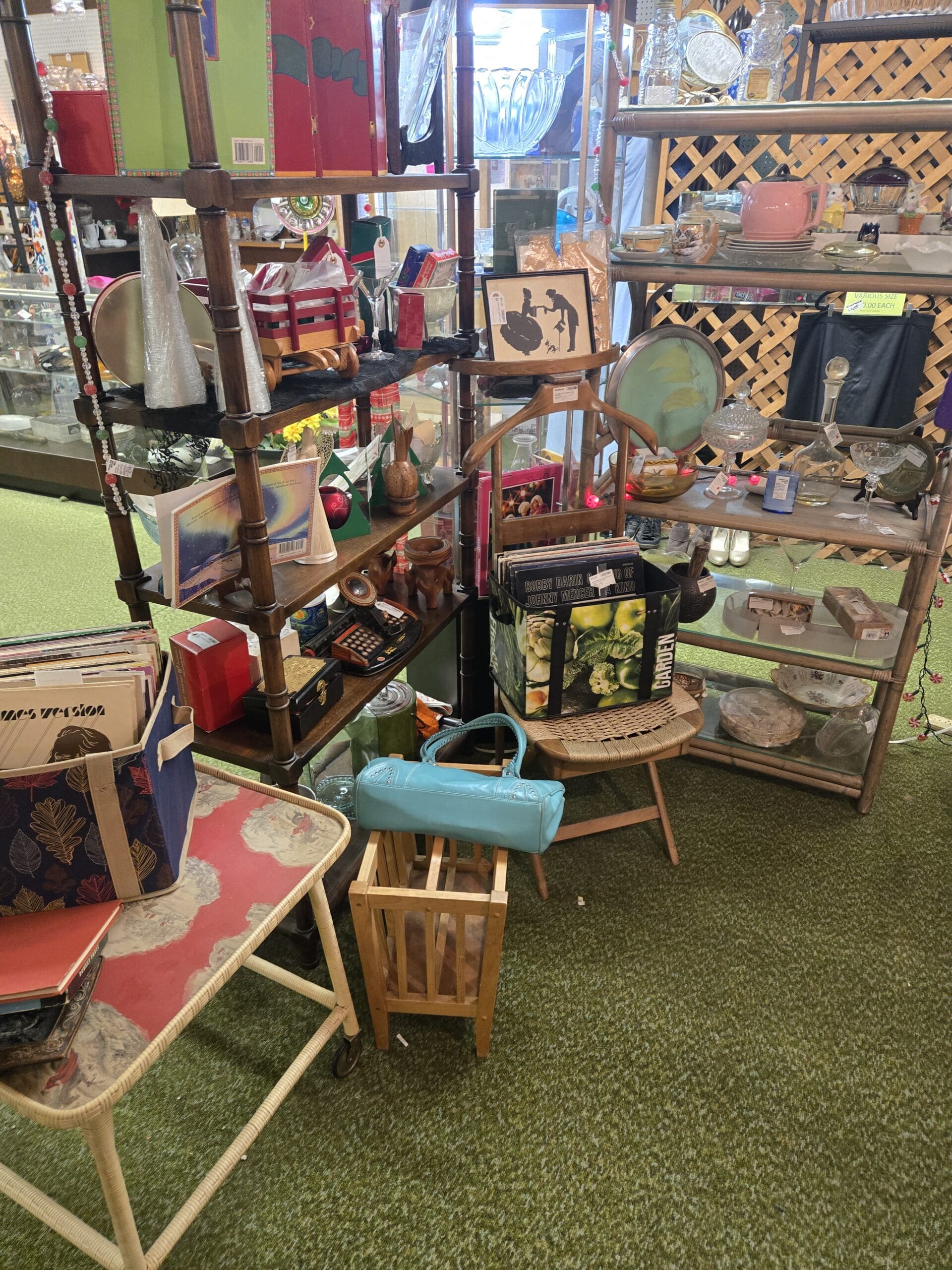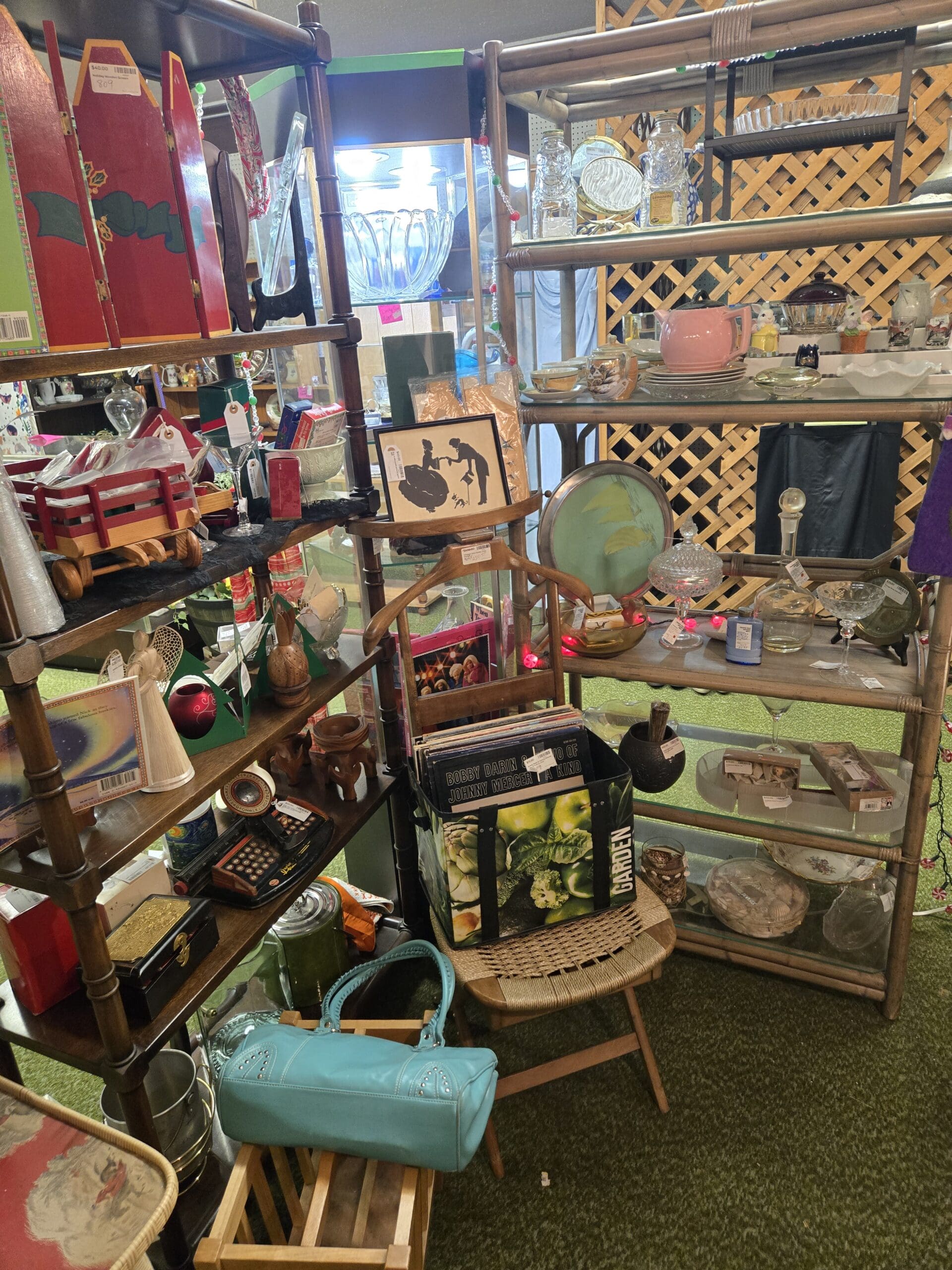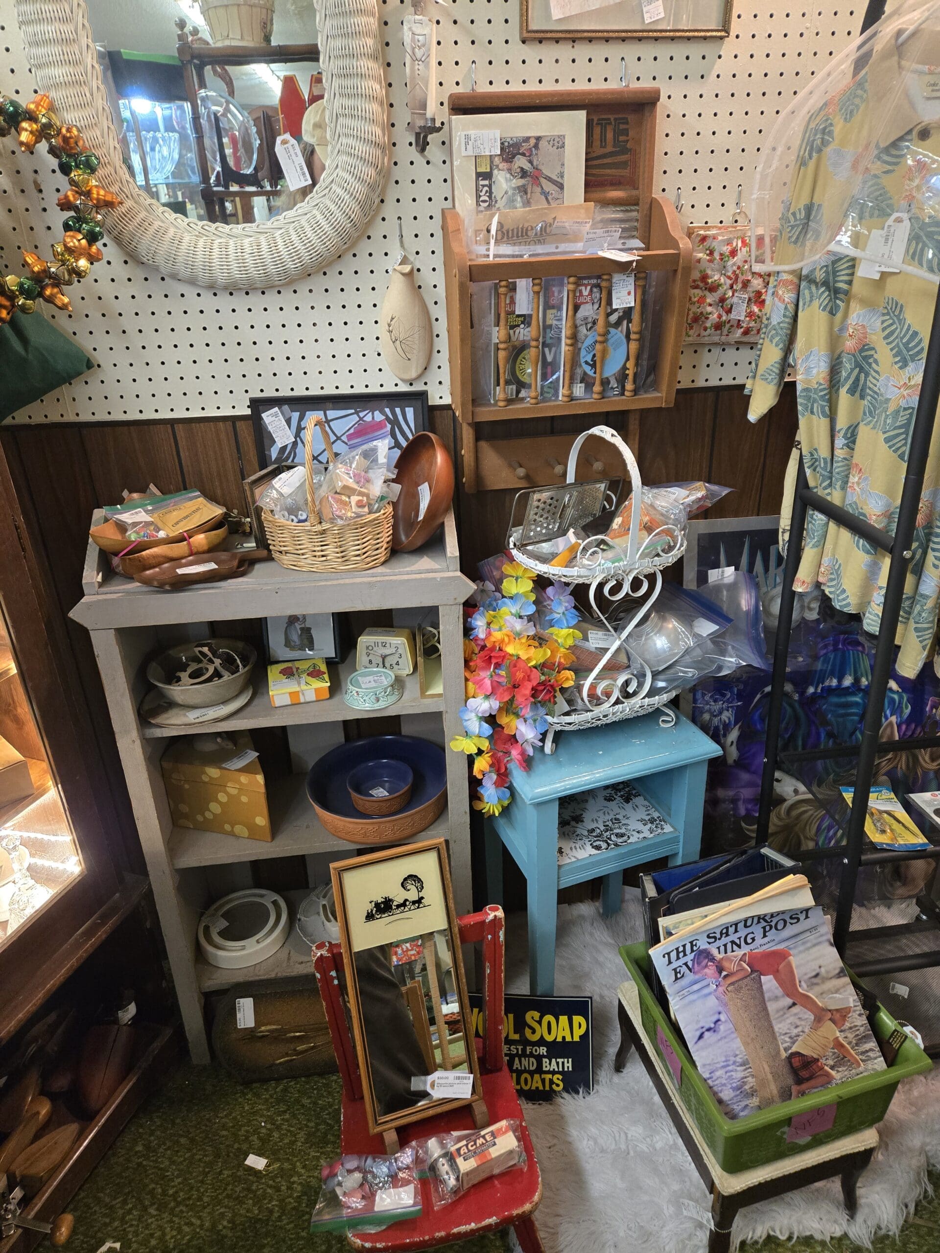 Vinyl records fill a crate near the center of the shop, with Bobby Darin and Johnny Mercer covers visible among the stacks, while a framed jazz musician silhouette print sets the mood nearby. Hawaiian shirts hang on a rack in garment bags, and a bin of Saturday Evening Post magazines sits on the floor alongside a "Wool Soap" tin sign. A white wicker crescent moon mirror, a turquoise bowling-style handbag, vintage sewing patterns, Butterick boxes, a "Where in the USA is Carmen Sandiego?" board game, and beer steins keep the surprises coming. Shop 809 is the kind of place where you walk in for one thing and leave with a bag full of finds you never expected.