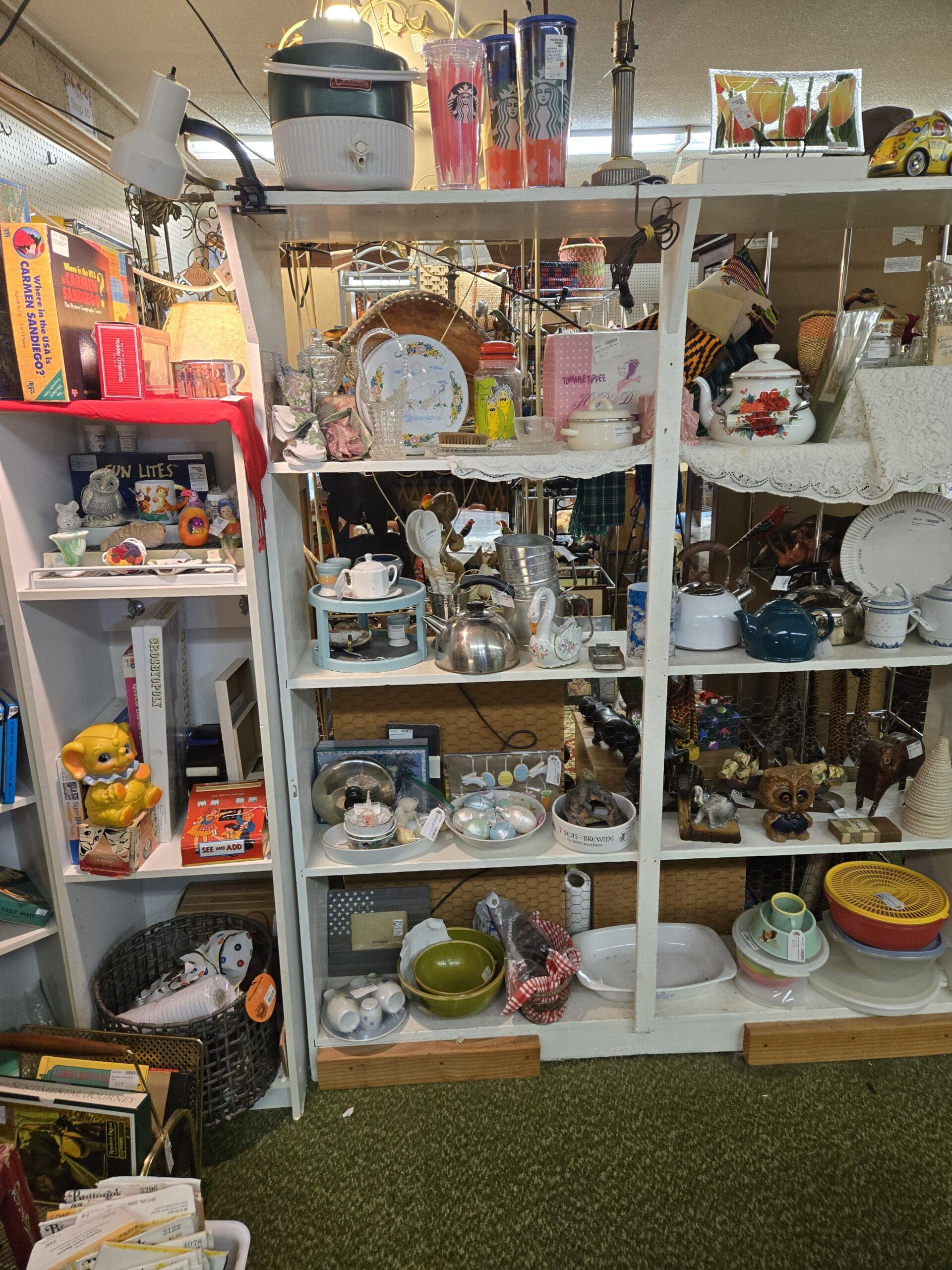 The retro kitchen collection runs strong throughout. An entire shelf is lined with tea kettles in stainless steel, blue enamel, and white porcelain, plus a hand-painted floral teapot and vintage Corning slow cooker. Carved wooden owls, a yellow elephant cookie jar, a cheerful cat bank, and Starbucks tumblers give the upper shelves a playful feel. A stained glass tulip panel, whimsical illustrated plates, and an avocado-green Pyrex bowl round out the mid-century kitchen vibe. Below, colorful Fiesta-style plates and an American flag picture frame keep things patriotic and bright.