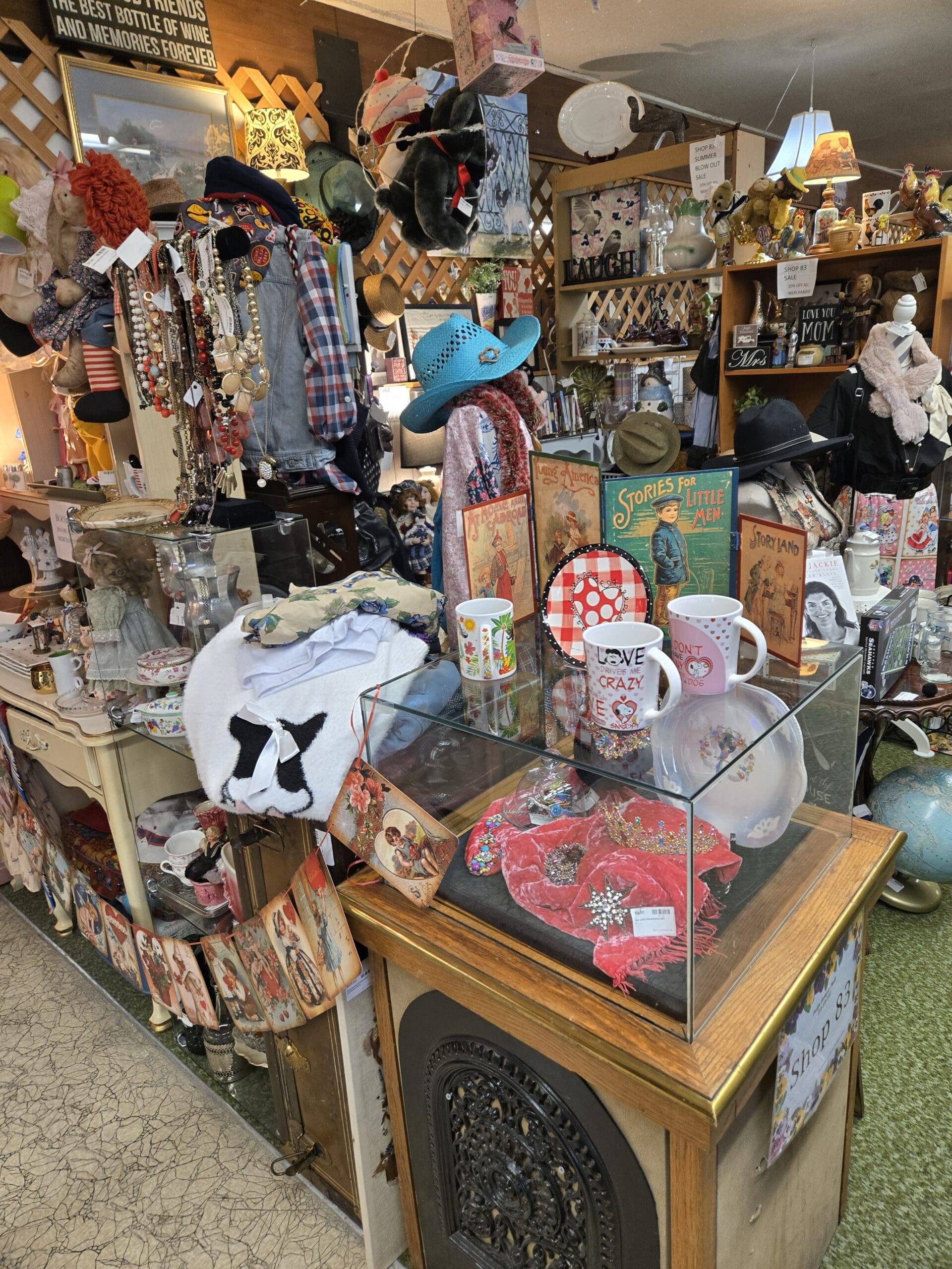 The charm continues with vintage children's books like "Stories for Little Men" and "Story Land," a cat-themed tapestry armchair, whimsical coffee mugs, and a See's Candies delivery truck collectible. A blue rose tea set sits on a carved French provincial side table, and framed watercolor prints and vintage photographs lean against the walls. Plush animals, a painted lampshade featuring roosters, and a "Good Food, Good Friends, Good Times" sign capture the warm, friendly spirit of Shop 83 perfectly.