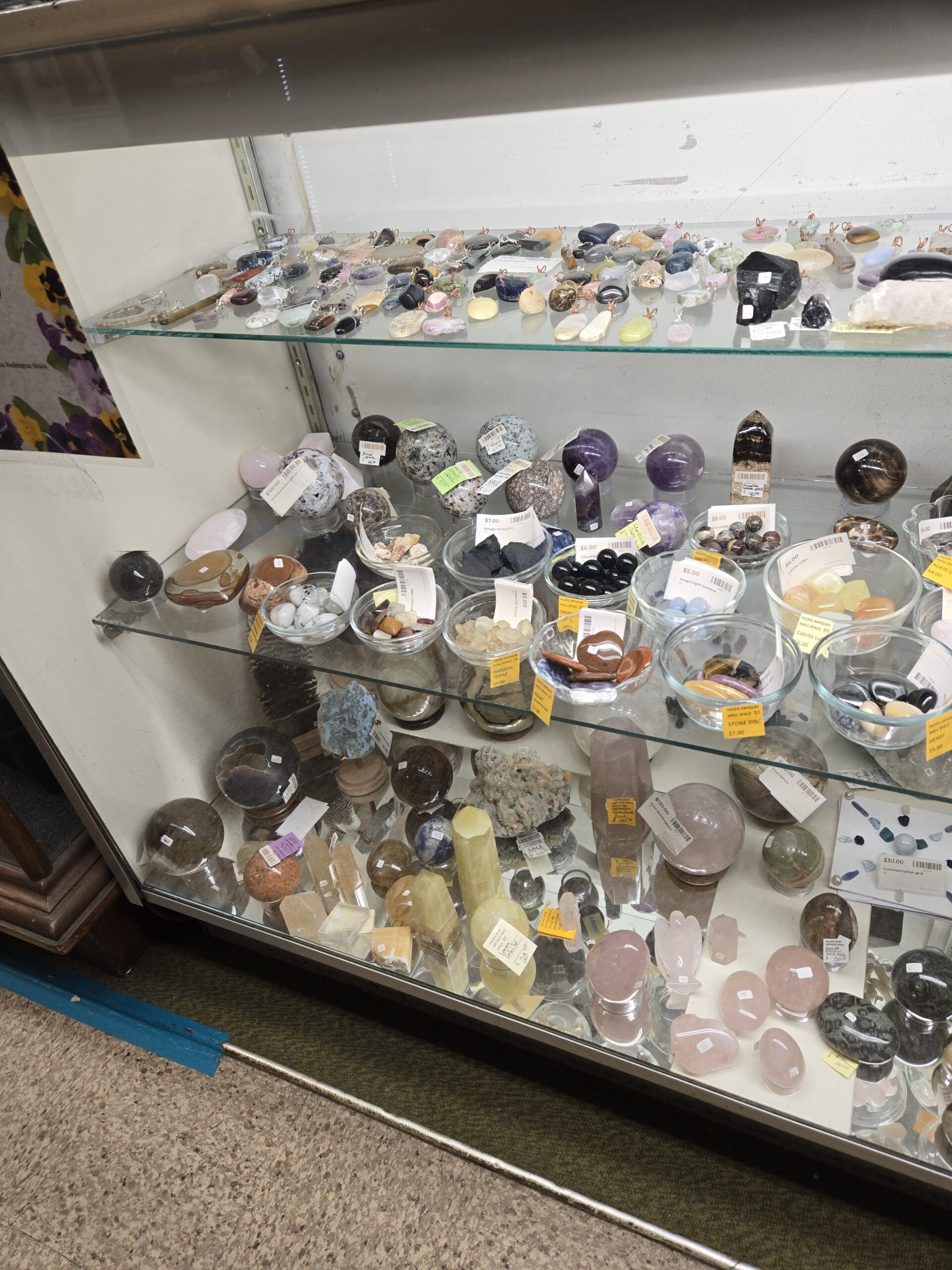 For collectors and crystal enthusiasts alike, the variety here is impressive. Glass bowls filled with tumbled stones are sorted by type, from black obsidian and blue lace agate to mookaite and kunzite, making it easy to browse and pick favorites. Wire-wrapped stone pendants line the top shelf for those looking for wearable pieces, and wooden display boards with drilled holes offer a beautiful way to show off a collection at home. Whether you're drawn to the metaphysical properties of the stones or simply love their natural beauty, Shop 88 has something at every level, from small palm stones to statement-sized spheres and towers.