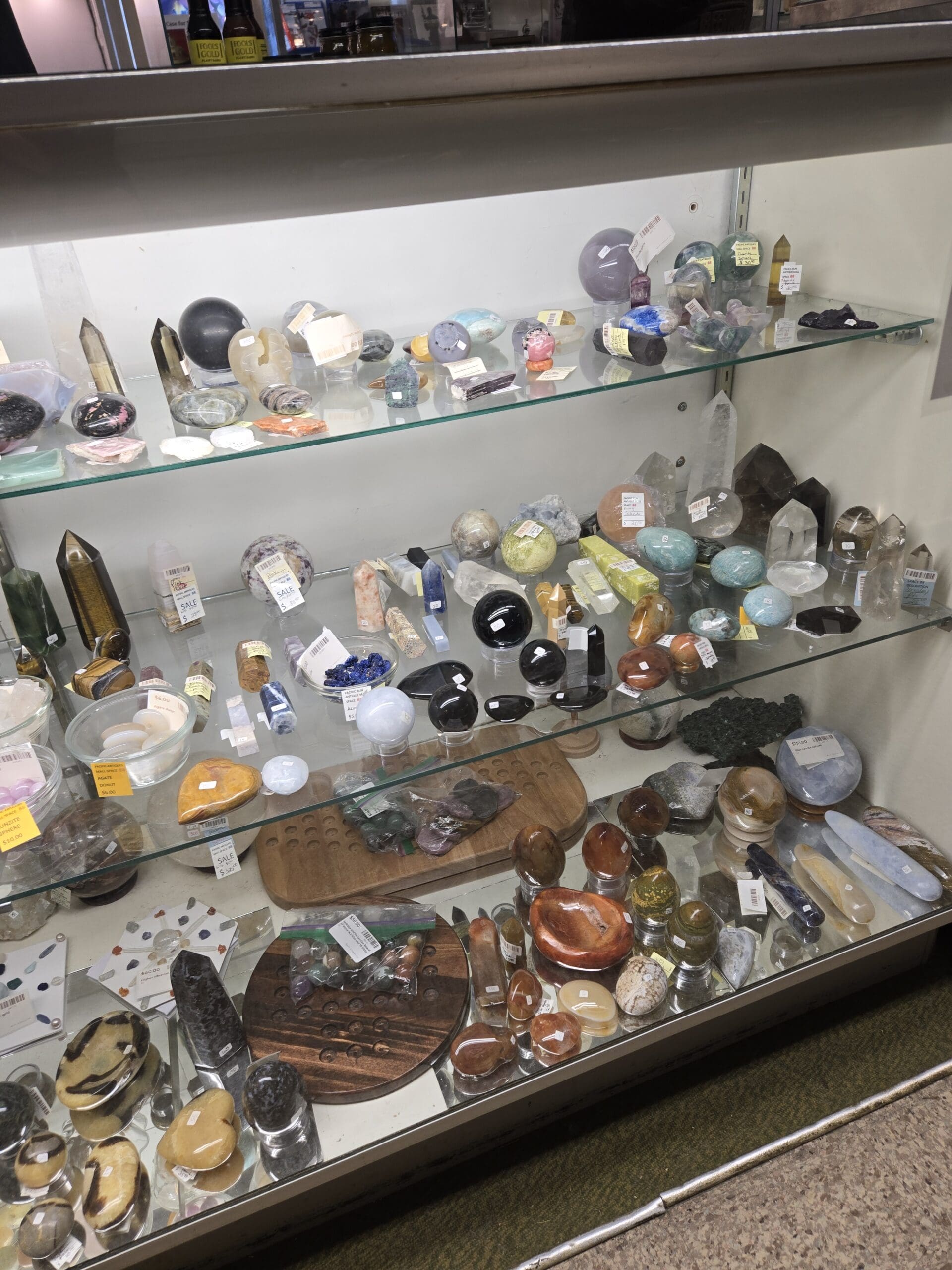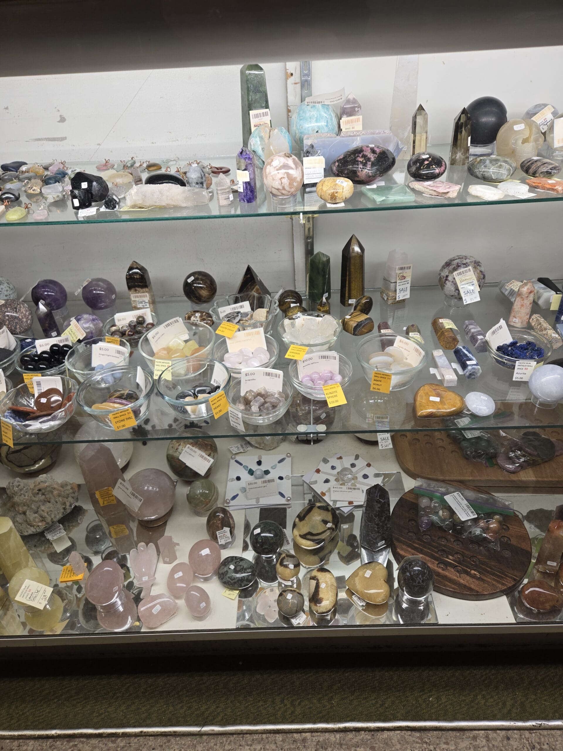 Visit Shop 88, where shelves upon shelves of crystals, polished stones, and raw minerals create a dazzling spread of natural color. Rose quartz hearts and spheres in soft pinks sit alongside deep purple amethyst points, tiger's eye towers with golden bands, and smoky quartz obelisks. Large polished eggs in rhodonite, labradorite, and ocean jasper catch the light, while clear quartz points and clusters sparkle from every angle. Chunky raw specimens, including geodes and rough-cut mineral chunks, offer a more rugged counterpoint to the polished pieces.